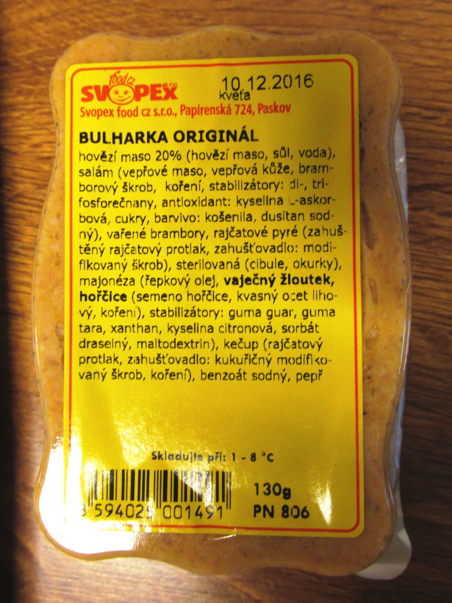 Při běžném preventivním odběru kontrolních vzorků inspektory Státní zemědělské a potravinářské inspekce (SZPI) ve výrobě lahůdek potvrdil laboratorní rozbor přítomnost bakterií Listeria monocytogenes v masné pomazánce Bulharka. Jde o šarži potraviny Bulharka - originál z hovězího masa, s označením data minimální trvanlivosti do 10. 12. 2016, výrobce: Svopex food cz s.r.o., Papírenská 724, 73921 Paskov. Potravinářská inspekce důrazně doporučuje všem spotřebitelům, kteří by mohli mít vzhledem k deklarované době trvanlivosti danou šarži potraviny doma, aby ji v žádném případě nekonzumovali.