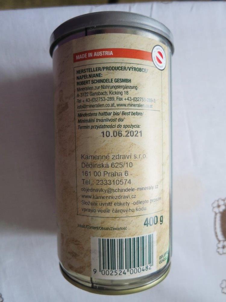 Stání zemědělská a potravinářská inspekce (SZPI) v rámci kontroly segmentu doplňků stravy zjistila nevyhovující výrobek SCHINDELE´S MINERALIEN, DMT: 10. 06. 2021, výrobce ROBERT SCHINDELE GESMBH, Mineralien zur Nahrungsergänzung, A-3122 Gansbach, Kucking 18, Rakousko.