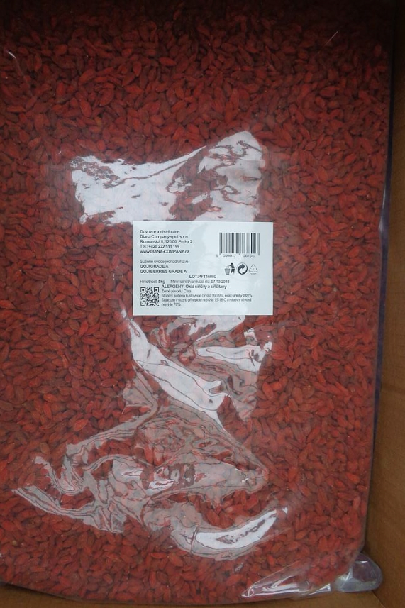 Jedná se o potravinu GOJI GRADE A – sušené ovoce jednodruhové, označené dobou minimální trvanlivosti do 7. 10. 2018, označení šarže: LOT: PFT16080, dodavatel: QINGDAO PERFECT IMPORT & EXPORT CO. LTD, ROOM 2201, UNIT 2, BUILDING 3, NO.7B SHANDONG ROAD, QINGDAO, Čína. Nevyhovující vzorek inspektoři odebrali s ohledem na sledování cizorodých látek, a to v provozovně společnosti Diana Company s. r. o., Rumunská 8, 120 00 Praha 2, která je i dovozcem potraviny do ČR.
