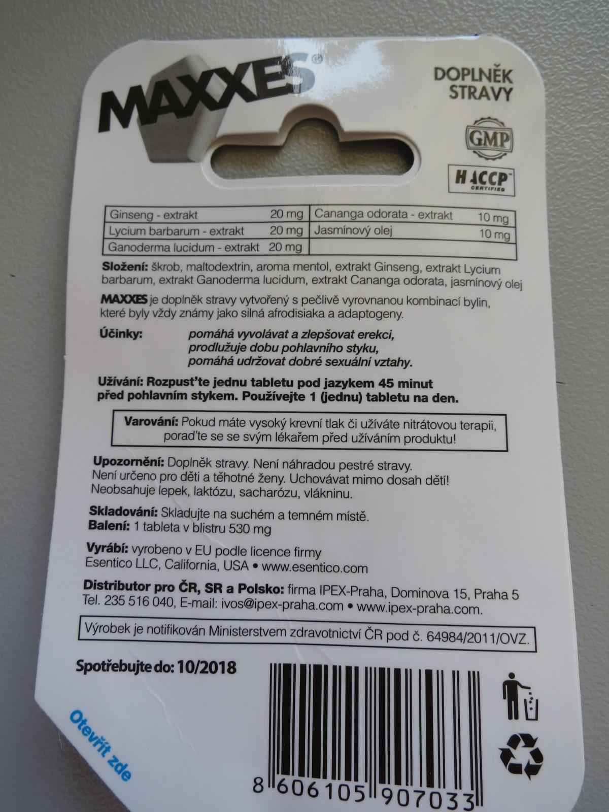 Laboratorní analýza prokázala přítomnost sildenafilu u následující šarže výrobku: MAXXES, datum použitelnosti 10/2018, a to v koncentraci 48,4 mg / 1 tableta.