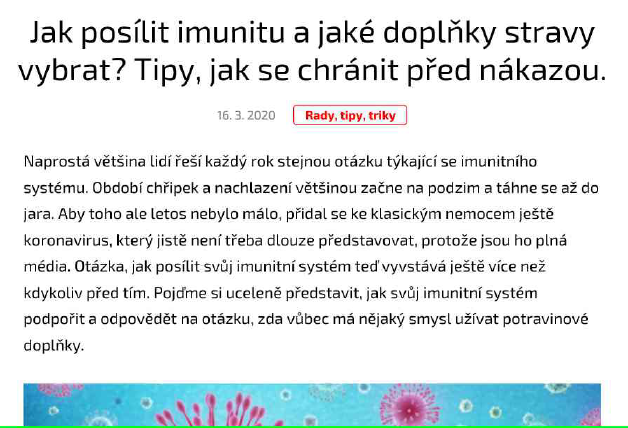 2. Reklama na doplňky stravy na stránce www.fitness007.cz, kontrolovaná osoba zde v reklamním článku na doplňky stravy uváděla nepovolená léčebná tvrzení: „Období chřipek a nachlazení většinou začne na podzim a táhne se až do jara. Aby toho ale letos nebylo málo, přidal se ke klasickým nemocem ještě koronavirus, který jistě není třeba dlouze představovat, protože jsou ho plná média. Otázka, jak posílit svůj imunitní systém teď vyvstává ještě více než kdykoliv před tím.“. Kontrolovanou osobou je společnost Sport Fitness Product s.r.o.