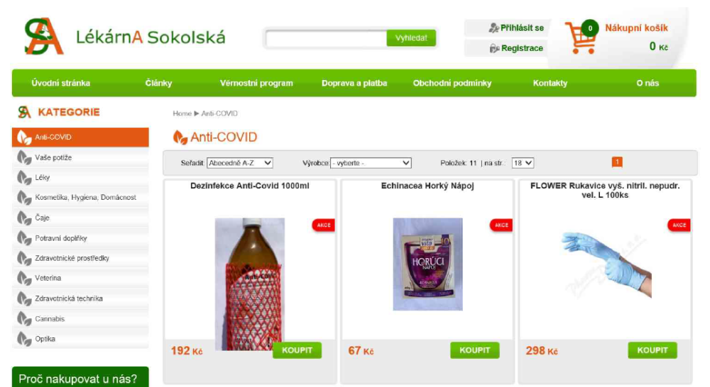 4. Nabídka doplňků stravy na stránce www.lekarnasokolska.cz, kontrolovaná osoba zde při nabídce doplňků stravy zřídila záložku s názvem „Anti-COVID“. Samotný název prodejní záložky je považován za zakázané léčebné tvrzení. Kontrolovanou osobou je společnost OTHER CORP s.r.o.