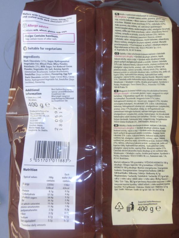 The Czech Agriculture and Food Inspection Authority (hereinafter “CAFIA” only) ordered Tesco Stores ČR, a. s. to withdraw immediately unsatisfactory foodstuff Wafers chocolate& hazelnut OATLAND, Oplatky s lísko-ořechovým krémem máčené v čokoládě – chocolate coated wafers with hazelnut cream, packaged à 400 g, best-before-date by 18. 3. 2014, country of origin: Poland. The producer provided following information on the labelling: “It may contain traces of other dry fruits and peanuts.” Laboratory analyses revealed presence of peanuts in the amount of 2,324 milligrams per kilogram. This amount exceeded approximately hundred times the maximum trace amount for peanuts. Due to the fact that the product contains bigger amount of allergen (peanuts) than declared on the labelling, it fails to meet requirements of Regulation (EC) No. 178/2002. It is a misleadingly labelled foodstuff that could cause serious health complications to people allergic to peanuts.