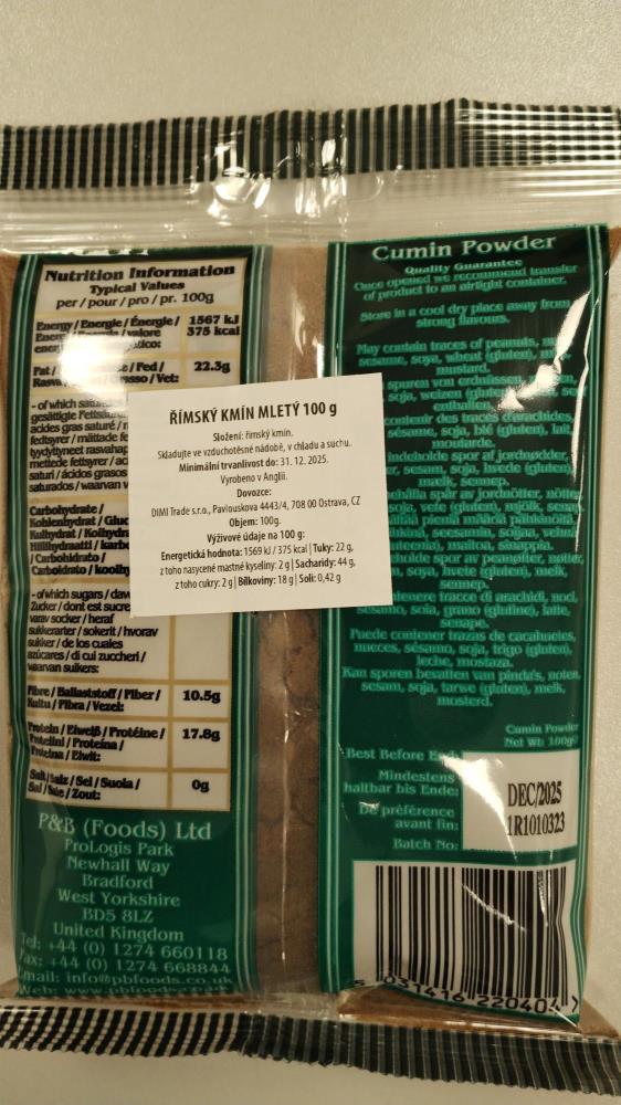 The foodstuff concerned is ground cumin - Heera Cumin Powder Premium Quality, packaged à: 100 g, lot designation: 1R1010323, best before date by: DEC/2025, importer: DIMI Trade s.r.o., Pavlouskova 4443/4, 708 00 Ostrava country of origin: Great Britain.