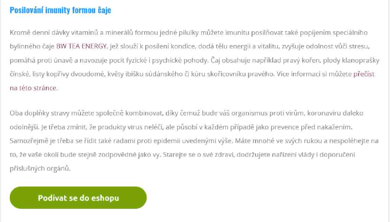 8. Within advertising foodstuffs BW Pills Multi&Immunity and tea BV TEA ENERGY on www.bodywraps.cz, the inspected person stated unauthorised medical claims, such as: “increased temperature”, “dry cough and dyspnoea”, “coronavirus affects persons with weakened immunity”, “cancer and weakened immunity”, “prevention against infection”, “respiratory diseases”, “respiratory problems”, “coronavirus”. Company Body Wraps s.r.o. is the inspected person.