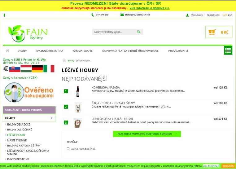9. Food supplements offered on www.fajnbyliny.cz, where the inspected person stated, inter alia, unauthorised claims, such as: “Medicinal mushrooms”, “Medicinal fruits, nuts and seeds”, “Current Virus Period”, “Asthma and bronchitis”, “Headaches, migraine”, “Pain in back, muscles and joints”, “Runny nose, cough and cold” and further. Jaroslava Koudelová, Horní Bříza is the inspected person.