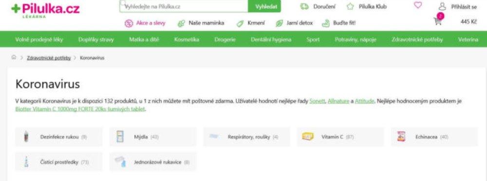 3. Food supplements offered on www.pilulka.cz, where the inspected person made a subcategory of food supplements under title “Coronavirus”. The name of the bookmark itself is regarded as a prohibited medical claim. Company Pilulka Distribuce s.r.o. is the inspected person.