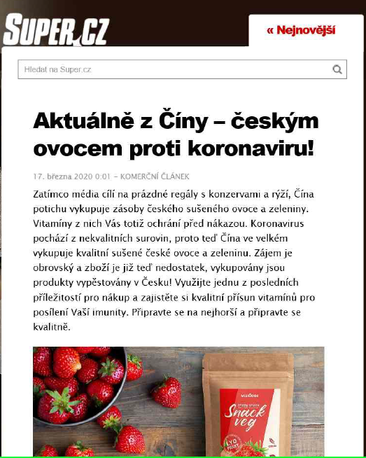 1. Website www.super.cz advertising food supplements, which could be purchased via a link to e-shop www.obezin.cz. In the advertising article, the inspected person stated, inter alia, following unauthorised medical claims: “Currently from China – with Czech fruit against coronavirus”, “protects against infection”, “key protection against viruses.” Company KR REAL s.r.o. is the inspected person.