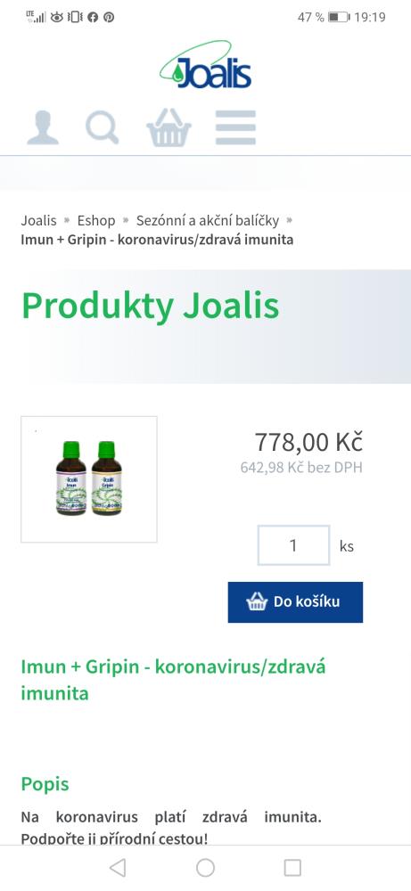 1. Internet sale in e-shop: www.joalis.cz, operator: ECONOMY CLASS COMPANY s.r.o.; in relation to foodstuffs Joaliss Imun and Joalis Gripin, the inspected person stated on the website (http://www.joalis.cz/cs/eshop/sezonni-a-akcnibalicky/imun-gripin-koronavirus-zdrava-imunita) following medical claims: “coronavirus”, “helps to protect body against various respiratory infections including the repeatedly mentioned coronavirus”, “important for coping with infection”, “prevention”. Using the banned claims the operator violated requirements of Regulation No. 1169/2011 on the Provision of Food Information to Consumers.