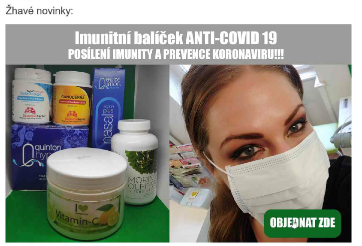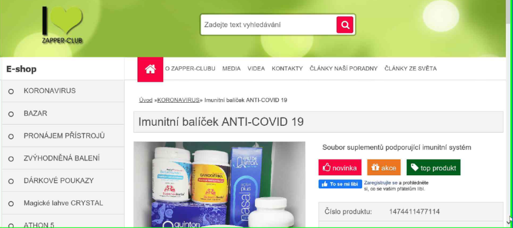 1. Advertising and sale of foodstuffs on https://www.parazitivnas.cz/, by Zapper-Club s.r.o. The inspected person offered “Immunity package ANTI-COVID-19”; banner on the website advertised foodstuffs Quinton hypertonic, Vitamin C, Betaglukan Maxcell 80%, Reishi ganoderma and Moringa oleifera. Already the denomination of the package itself contained medical claim “ANTI-COVID-19” and the description of the package contained text “prevention of coronavirus”.