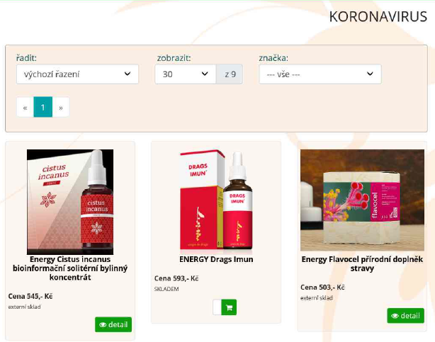 2. Internet sale on http://www.biobeauty.cz, inspected person: BioBeauty s.r.o. The operator of the website offered following foodstuffs in subsection titled “Coronavirus”. Energy Flavocel natural food supplement, Energy Imunosan natural food supplement and Oro Verde Sangre de Drago/Dragon blood. Already such denomination of the subcategory is regarded as unauthorized medical claim and consumers may have impression that the foodstuffs in question have medical effects.