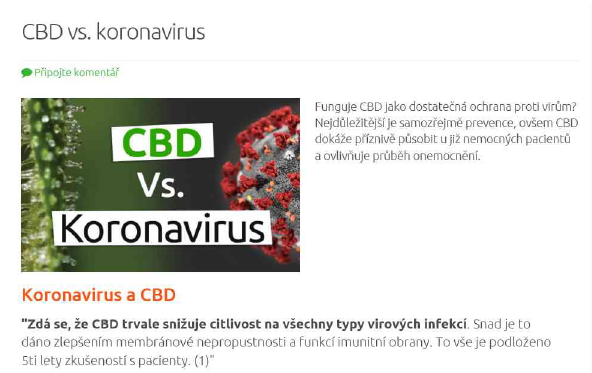 3. Internet sale on e-shop www.zelenazeme.cz, inspected person: Zelená Země s.r.o. In the article published on the website under name “CBD vs. koronavirus”, the operator offered food supplements containing CBD as a prevention against coronavirus. CBD is a synonym for cannabidiol which belongs into the group of substances called cannabinoids. Products CBD capsules - 100 pieces (*1000 mg CBD), CBD Cannabis oil 10%, 10 ml, and CBD Coconut oil 170 ml were concerned.