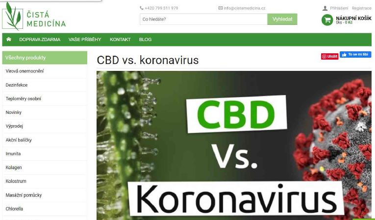 Offer of food supplements on www.cistamedicina.cz, the inspected person offered here, inter alia, prohibited medical claims: "CBD seems to reduce steadily the sensitivity to all types of viral infections. May be it is caused by improving the membrane permeability and by the function of the immunity protection. All this is based on 5-years’ experience with patients.”, “If you use CBD and you catch an infection, the illness usually lasts shorter time and has milder course.” Company Čistá Medicína s.r.o. is the inspected person.