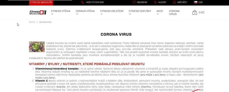Offer of food supplements on https://fitnessmuscle.eu/cs/corona-virus, the inspected person stated here, inter alia prohibited medical claims: ”Corona virus“, “Vitamins / Herbs / Nutrients helping enhancing the immunity.” Company Fresh2Go s.r.o. is the inspected person.