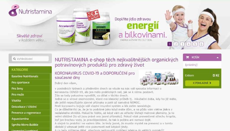 Offer of food supplements on nutristamina.cz/cs/, the inspected person offered here, inter alia, food supplements by means of article “CORONAVIRUS COVID-19 RECOMMENDATIONS for present days”, furthermore, prohibited medical claim “Elixir – strong support for the immunity on purely natural basis” was stated at one of the products. Company NUTRISTAMINA s.r.o. is the inspected person.