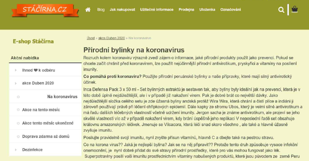 Offer of food supplements on www.stacirna.cz, in the part named as “Against coronavirus”, the inspected person stated, inter alia, prohibited medical claims: “Fuss about coronavirus significantly increased interest in information, which natural products could be used as a prevention. If you want to protect yourself against coronavirus, you can buy the most effective natural antiviral - resin and vitamins to enhance your immunity.”, “What helps against coronavirus? Use natural Peruvian herbs and our preparations with a strong antiviral effect.” At selected products, the inspected person stated, inter alia: “This extract has strong antimicrobial, antibacterial, antimycotic and antiviral effects in particular against herpesviruses.”, “Effective as natural antibiotics”, “Antiviral extract set”, “Natural herbs and healing Peruvian herbs against coronavirus”, etc. Company Objednejte u nás s.r.o. is the inspected person.