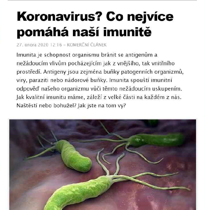 Advertising of food supplements on www.super.cz, which could be purchased via a link to www.wurm-ex.cz. The inspected person stated here, inter alia, prohibited medical claims: “Coronavirus? What helps our immunity the most?”, “Immunity is the ability of an organism to fight against antigens and undesirable external and internal effects. Antigens are in particular cells of pathogenic organisms, viruses, parasites or tumoral cells.” Company Clinex a.s. is the inspected person.