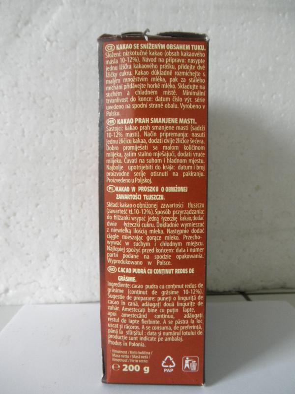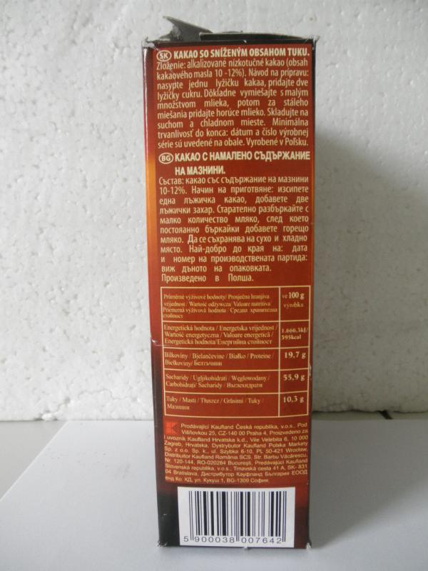 Company Kaufland Česká republika, v. o. s. had to withdraw four lots of adulterated cocoa from its shops during last six months. This withdrawal was ordered by the Czech Agriculture and Food Inspection (CAFIA). The Inspection Authority currently detected adulteration of product Kakao Grande with reduced amount of fat (packaging: 200 g, best before date: 3.2013/3, producer: unknown, distributor: Kaufland, country of origin: Poland). Laboratory analysis showed that 100% cocoa powder contained no more than 80% of cocoa. Additional test focused on the content of triptamide lignoceric acid further showed that missing cocoa was substituted by woody substance consisting of ground cocoa husks.