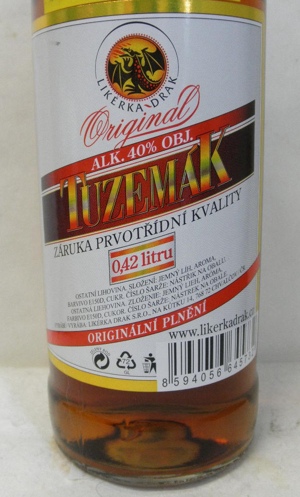 The Czech Agriculture and Food Inspection Authority (CAFIA) revealed an extraordinary high concentration of methanol in a sample of spirit drink taken in a non-registered storehouse of VERDANA s.r.o. in Zlín's locality Rybníky. Laboratory analysis detected presence of methanol in concentration of 535,847 milligrams per litre of absolute alcohol (mg/l a.a.) in a product labelled and tax stamped by Likérka Drak s.r.o. - Original Tuzemák of 40% of alcohol, in package ŕ 0.42l with label and tax stamp of Likérka Drak s.r.o. Methanol thus represented a half of all alcohol in the consumer's package. It was highly toxic mixture packaged as foodstuff by the producer and prepared for expedition to retail network.