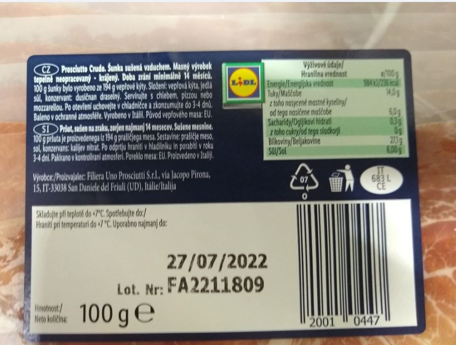 CAFIA ordered company Lidl Česká republika v.o.s. to immediately withdraw the non-compliant food ITALIAMO Prosciutto Crudo with best before date by 27 July 2022, batch number FA2211809, manufacturer Filiera Uno Prosciutti S.r.l., via Jacopo Pirona, 15, IT-33038 San Daniele del Friuli, Italy, country of origin: Italy.