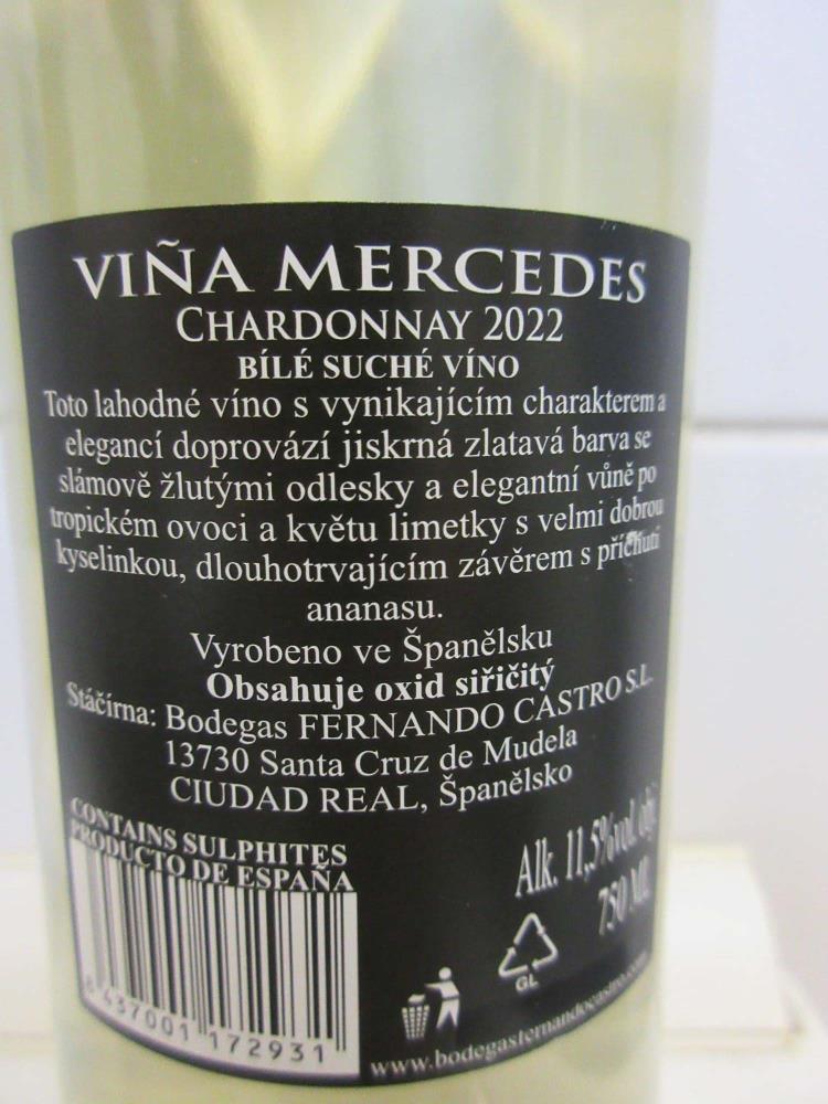 The product in question was Viña Mercedes, Chardonnay, produced by Bodegas FERNANDO CSTRO S.L., 13730 Santa Cruz de Mudela, CIUDAD REAL, country of origin: Spain. Three lots (L-10.01.23, L-07.09.22, L-12.01.23) were taken at the retail network of Tesco Stores ČR a.s. and one lot (L-09.01.23) at Albert Česká republika, s.r.o.